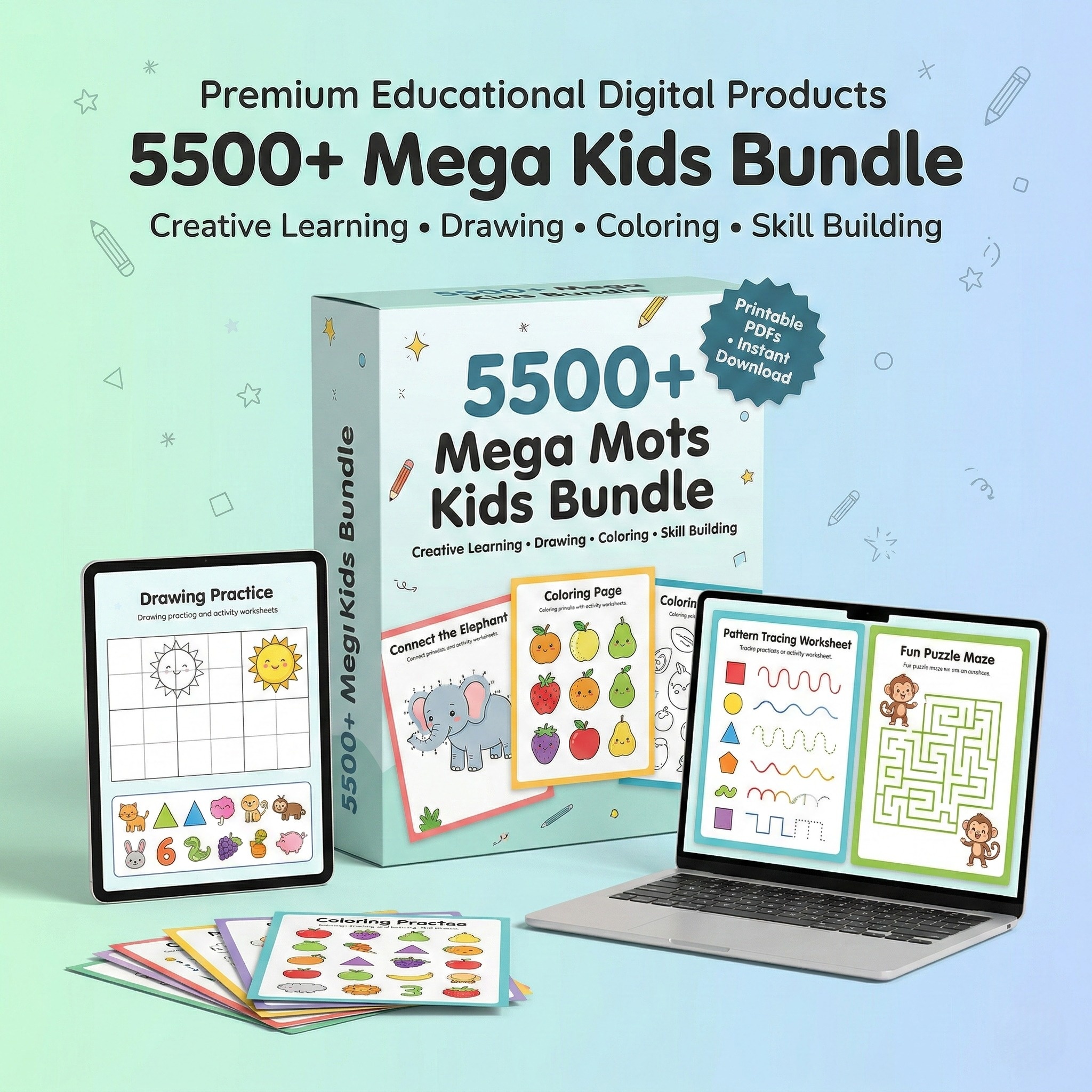 The mega kids bundle includes 5500+ printable creative worksheets designed for preschool and early elementary children. Instead of searching for separate activity sheets, this mega kids bundle provides a complete, organized collection.
